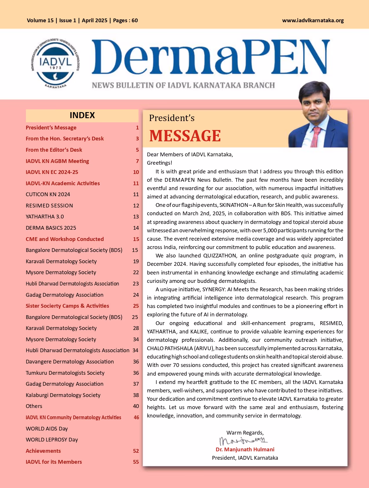 It is my great honor to serve as the President of the Indian Association of Dermatologists, Venereologists, and Leprologists (IADVL) Karnataka...